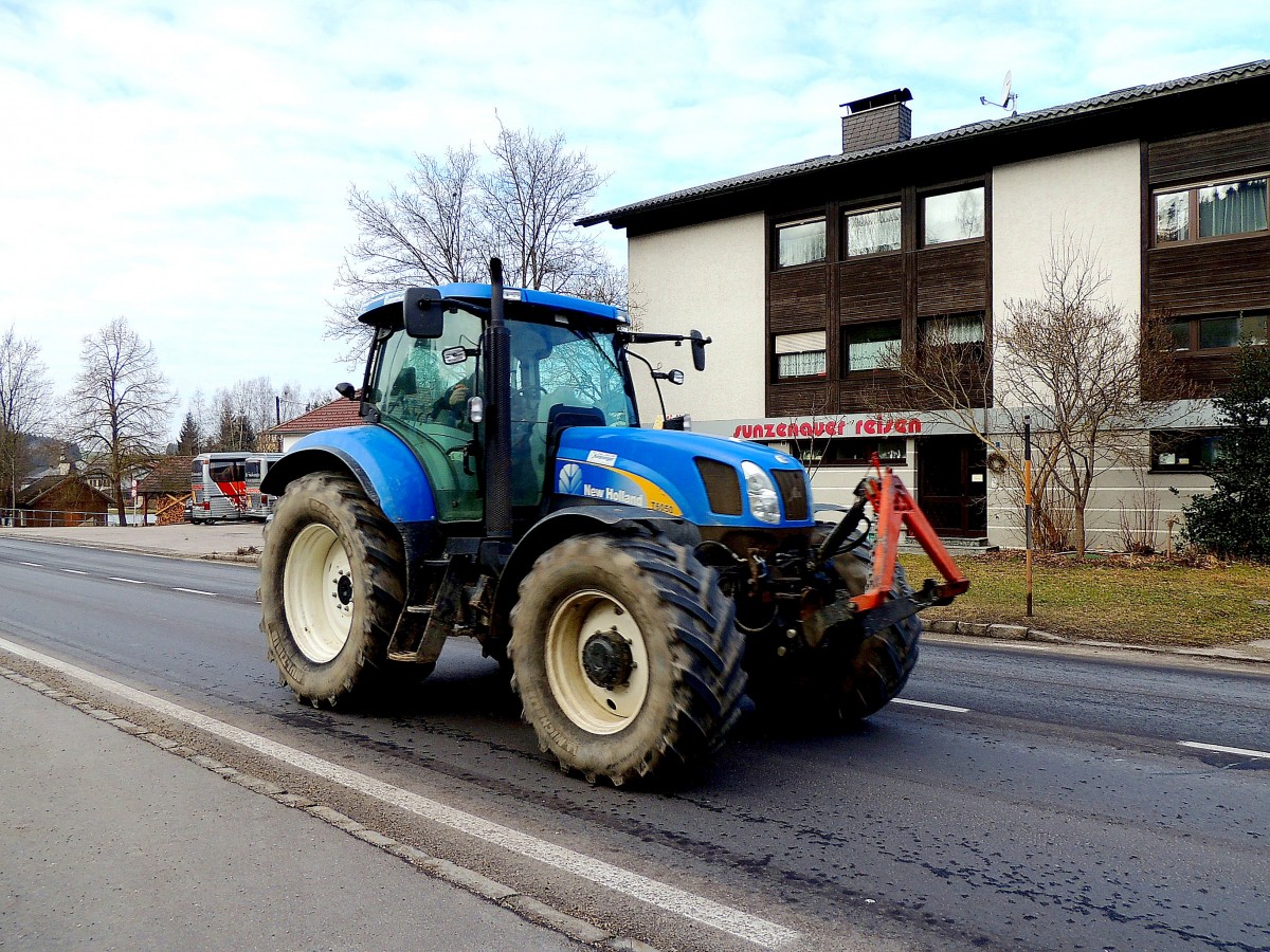 NEW-HOLLAND T6050, rast mit rasantem Tempo auf der B124 in Richtung Königswiesen; 150307