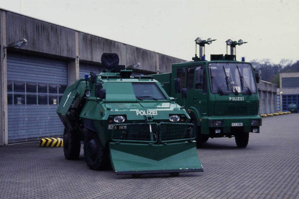 dieser Sonderwagen von Thyssen und der dahinter sichtbare Mercedes Wasserwerfer