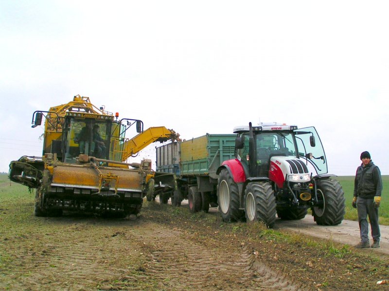 mit einer Antriebsleistung von 436kW(604PS) schafft er bis zu 2Ha/Std. und kann ~40m³(26-29Tonnen)Rüben zwischenbunkern.