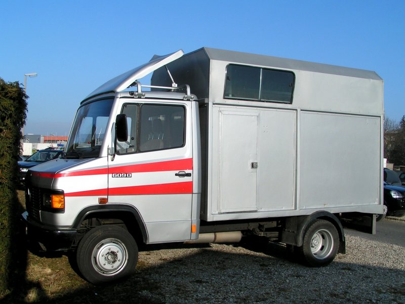 MB 609D in Tiertransporter-Ausführung ist das Alter von ca. 15 Jahren nicht anzusehen, und steht vor der FIH-Versteigerungshalle in Ried i.I.; 090113 JohannJ
