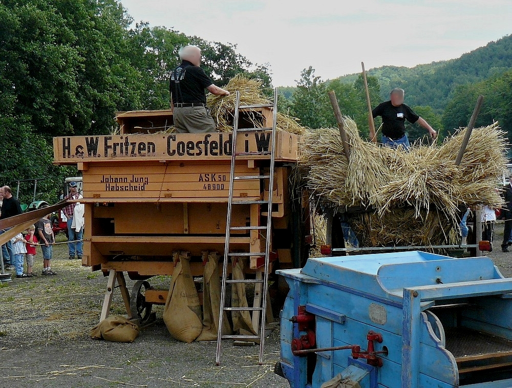 Bis in die 70iger Jahre mussten die Bauern auf diese Art in mühsehliger Arbeit ihr Getreide dreschen, das wurde meistens in den Wintermonaten auf dem Hof in der Scheune gemacht. Hier wurde es auf der Oldtimeraustellung in Prüm vorgeführt. 01.08.2010 De Rond Hans und Jeanny