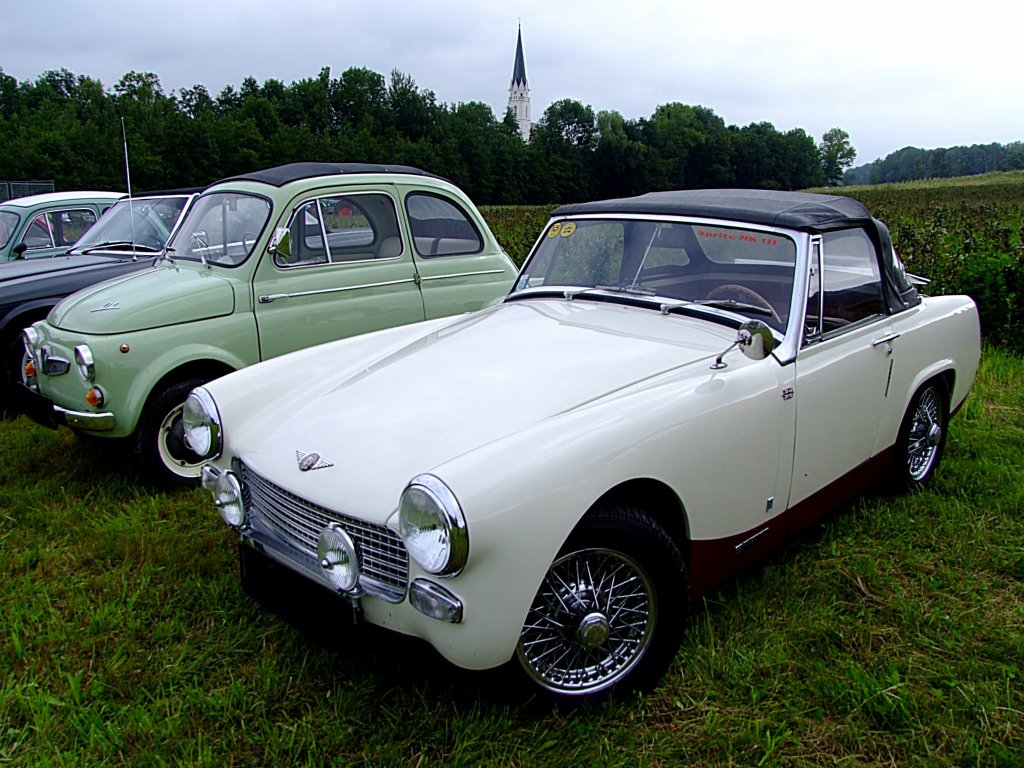 Austin Healey Sprite Mark I. 1958 - 1961. Der 4-Zylinderreihenmotor aus dem Austin A35 leistet 44 PS aus 948 cm³ Hubraum. Aufgrund der Anordnung seiner Scheinwerfer erhielt der Sprite im Volksmund den Namen "Frogeye". Oldtimertreffen Kokerei Zollverein am 02.10.2011. Michael H.
