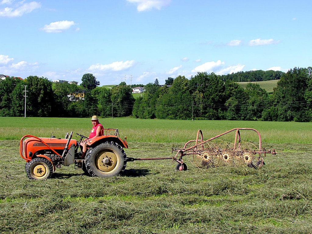 Deutz-Fahr Allradschlepper, mit Schwadkreisel von der österreichischen Firma Pöttinger bei der Heuernte, Aug.2011