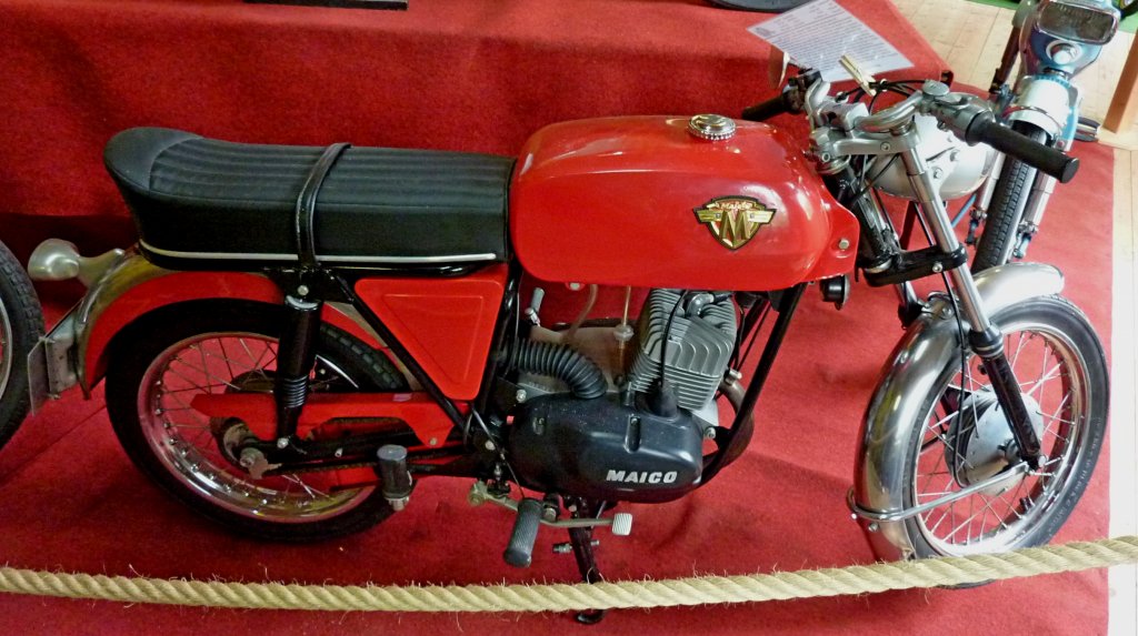 Maico Taifun, Baujahr 1955, 2-Zyl.2-Takt-Motor mit 394ccm und 22,5PS, Vmax.130Km/h, die Maschine aus Pfäffingen bei Tübingen gehörte mit Leichtbaurahmen und Vollschwinge zu den modernsten seiner Zeit, Automuseum Schramberg, Mai 2012 rainer ullrich