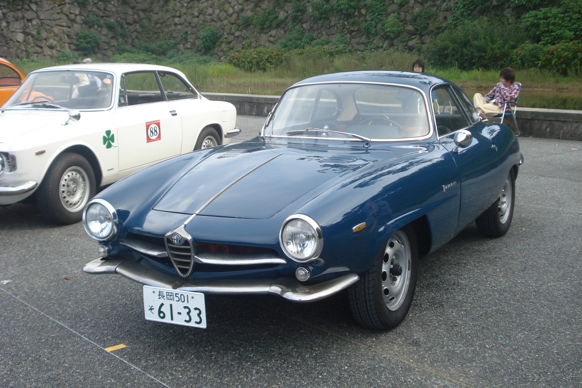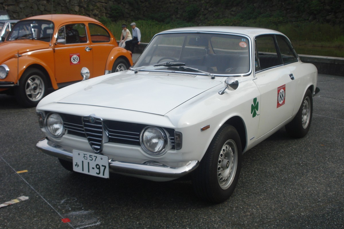 Alfa Romeo GT 1300 Junior. 1966 - 1970. Die GT oder auch Sprint genannten Modelle waren die zweitürige Coupeversion der bereits 1962 vorgestellten Giulia. Der 4-Zylinderreihenmotor mit 1.290 cm³ Hubraum leistet 89 PS. Im Jahr 1970 erfuhr das Coupe ein Facelift. Die Modelle vor diesem Facelift werden aufgrund der etwas abgesetzten Motorhaube auch "Kantenhauber" genannt. Classic Remise Düsseldorf am 26.01.2013. Michael H.