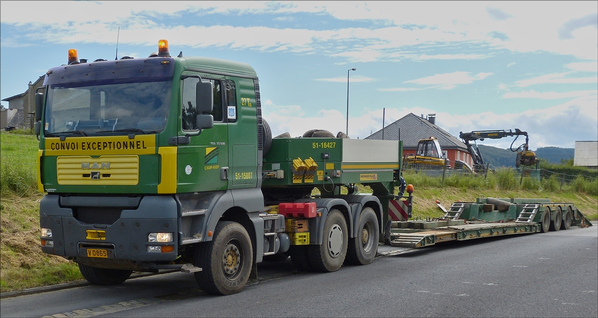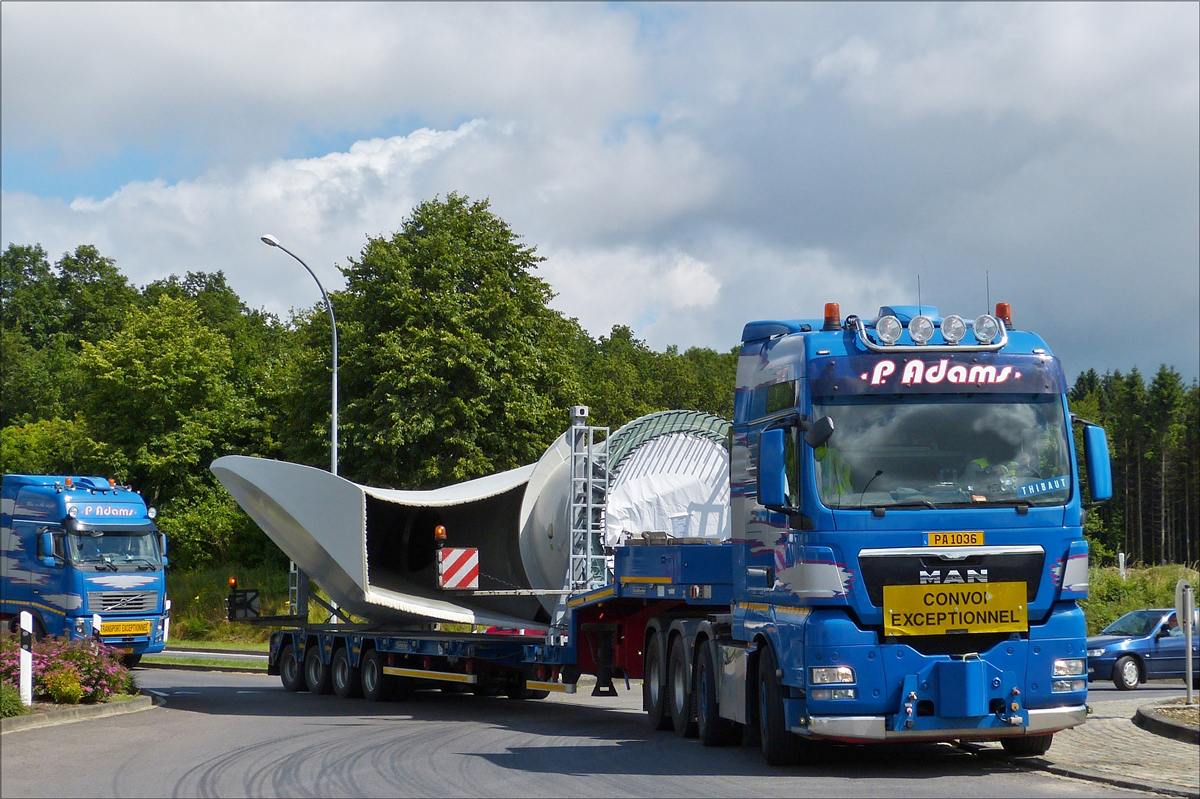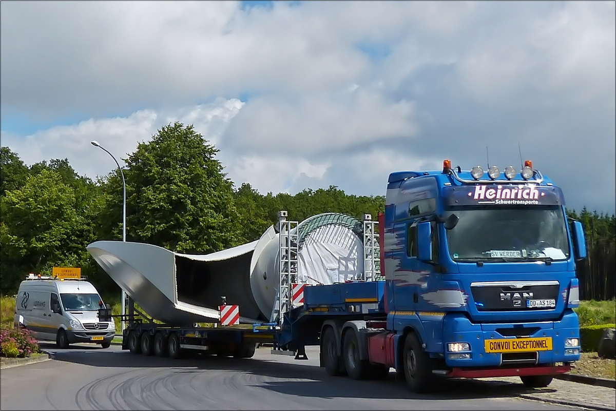 MAN Schwerlasttransport mit 3 Achsiger Zugmachine, beladen mit Teilen einer Windkraftanlage, bewegt sich im Krichgang durch einen Kreisverkehr im Norden von Luxemburg. 13.07.2016 De Rond Hans und Jeanny