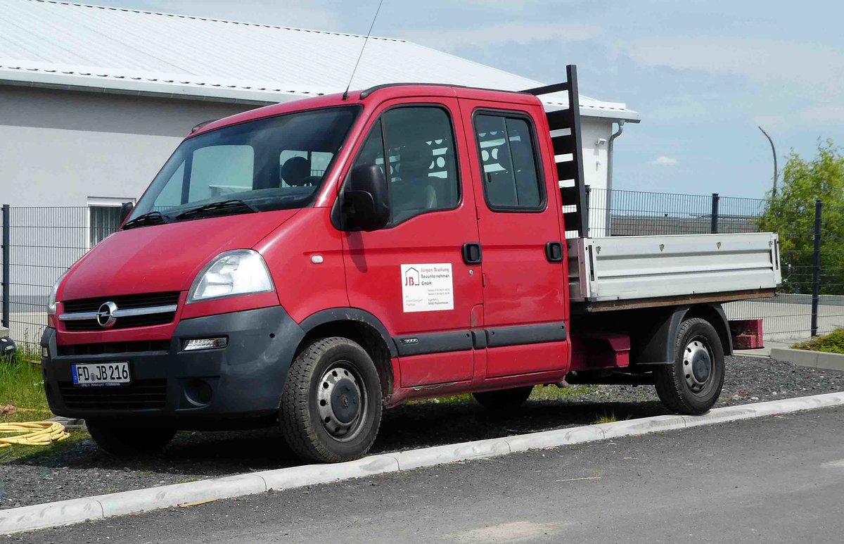 =Opel Movano als Doppelkabiner mit Ladepritsche steht auf einer Baustelle in Fulda, Mai 2017