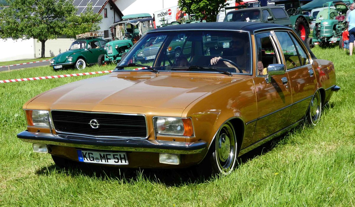 Opel Rekord D als viertürige Limousine. 1972 - 1977. Den Rekord D gab es als zwei- und viertürige Limousine, als Coupe und als Kombimodell CarAvan. Als das Modell am 19.01.1972 vorgestellt wurde, fand er sofort enormen Anklang und erreichte vorher nie erreichte Verkaufszahlen. Motorisiert war der Rekord D mit einem 4-Zylinderreihenmotor, der wahlweise mit 1.7l, 1.9l und ab 1975 auch mit einem 2.0l geordert werden konnte. Der abgelichtete, signalgelbe Rekord ist mit dem 1.9l Motor ausgerüstet und entstammt dem Modelljahr 1974. Oldtimertreffen Glandorf am 14.05.2017. Michael H.