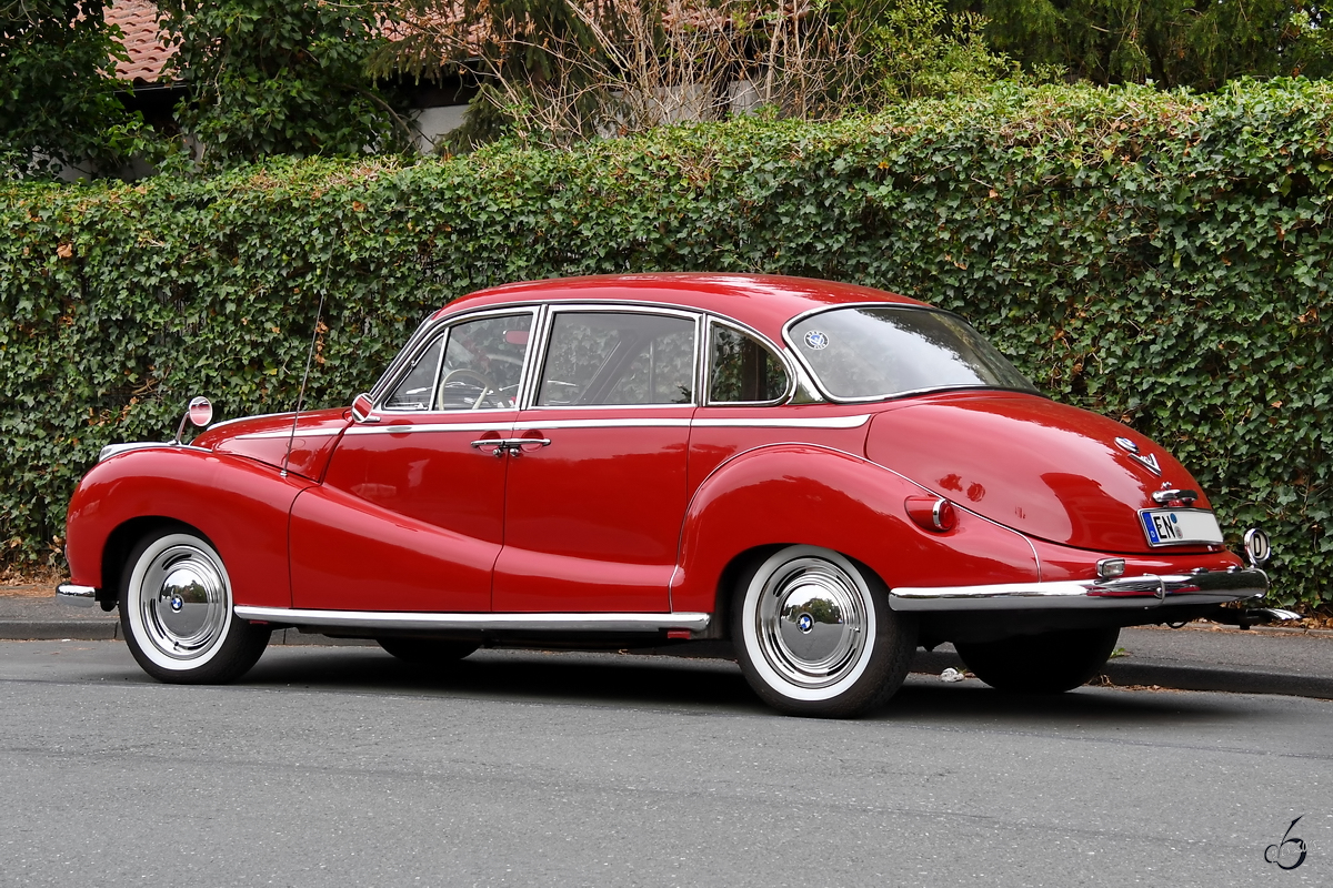 BMW 502. 1954 - 1961. Der 502 war der erste deutsche Achtzylinder PKW, der nach dem Krieg vorgestellt wurde. Die V8-motoren leisteten 100 PS (2.6l), 120 PS (3.2l) und 140 PS (3.2l Super). Insgesamt liefen 9.109 BMW 502 vom Band. Prinz-Friedrich Oldtimertreffen am 06.05.2018 in Essen-Kupferdreh. Michael H.