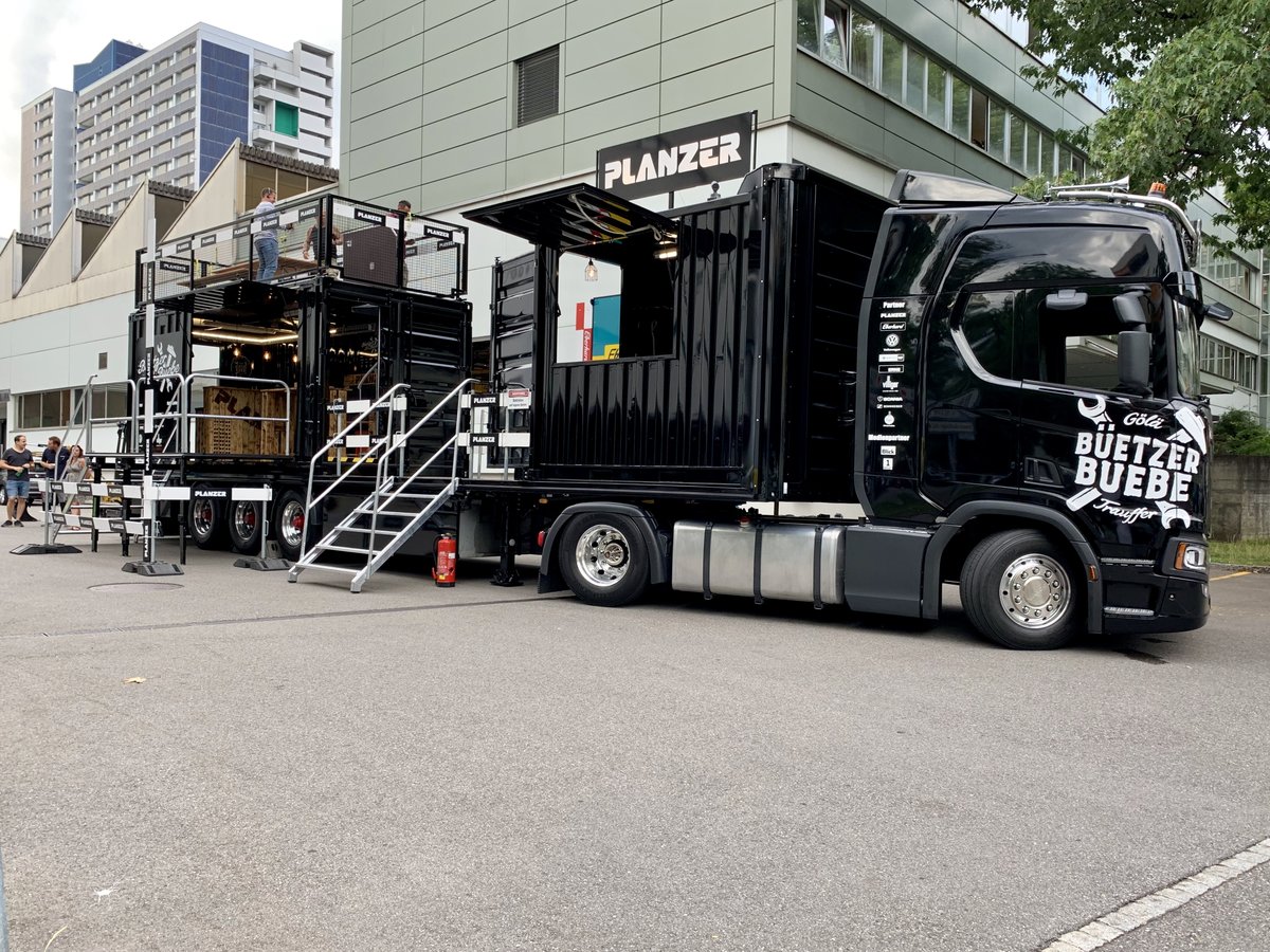 Scania Sattelzug von Planzer, mit dem die  Bützer Buebe  (Gölä und Trauffer) auf Promotour in der Schweiz waren, am 5.8.19 in Bern Bethlehem.