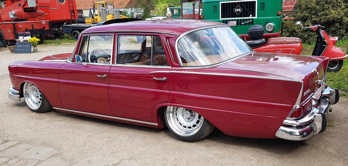 Mercedes Benz W110 190, gebaut von 1961 bis 1965. Die "kleine Heckflosse" erschien 1961 und war mit einem 1.897 cm³ Vierzylinderreihenbenzinmotor oder einem 1.988 cm³ Vierzylinderreihendieselmotor lieferbar. 1965 erhielt die W110 Baureihe ein Facelift, mit dem das Modell bis 1968 weiter gebaut wurde. Oldtimertreffen an der "Alten Dreherei" in Mülheim an der Ruhr am 18.06.2023. Michael H.
