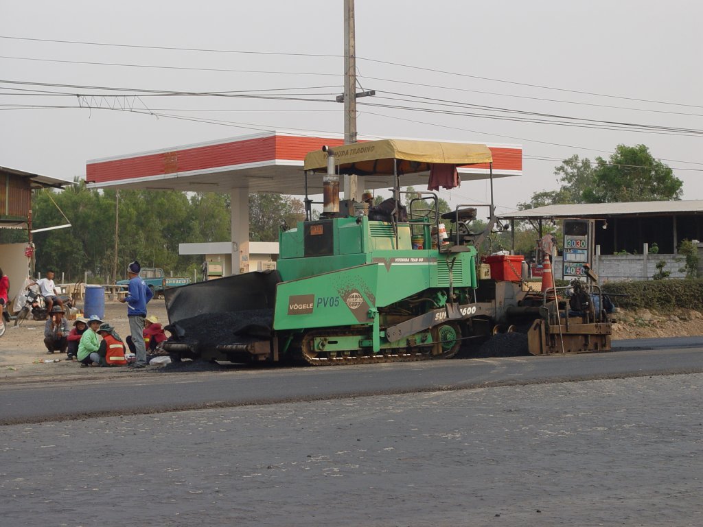 Dieser Asphaltfertiger Super 1600 von Fa. Vögele der Wirtgen Group beim Straßenbau in der Nähe von Satuk im Nordosten Thailands am 11.02.2011