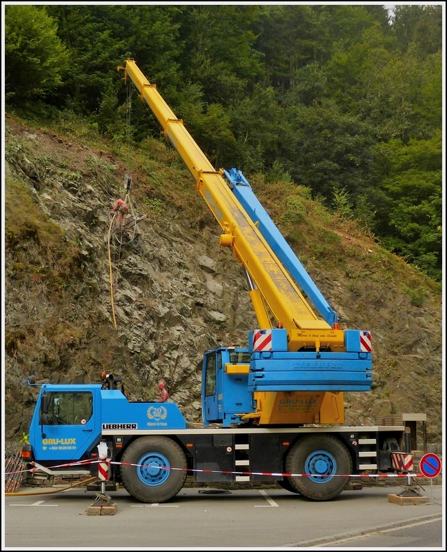Mit Hilfe dieses Autokrans werden Arbeiten über dem Eisenbahn Tunnelportal in Clervaux Felsbefestigungsarbeiten durchgeführt. 05.09.2012