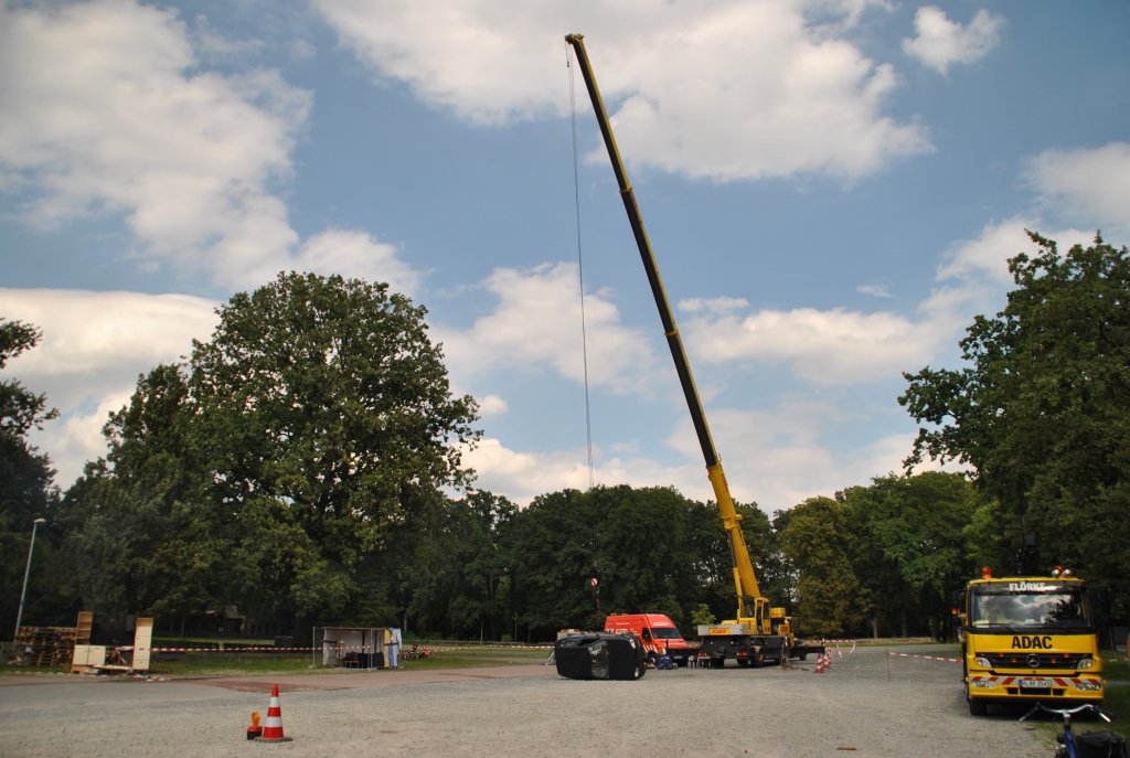 Teleslop Kran, von Autovermieter Flörke in Lehrte. Der Kran wurde gebraucht, um einen alten Ford Mondeo in Luft zu heben und aus 18. Meterhöhe auf diesen alten Golf fallen zu lassen. Foto vom 21.08.2010