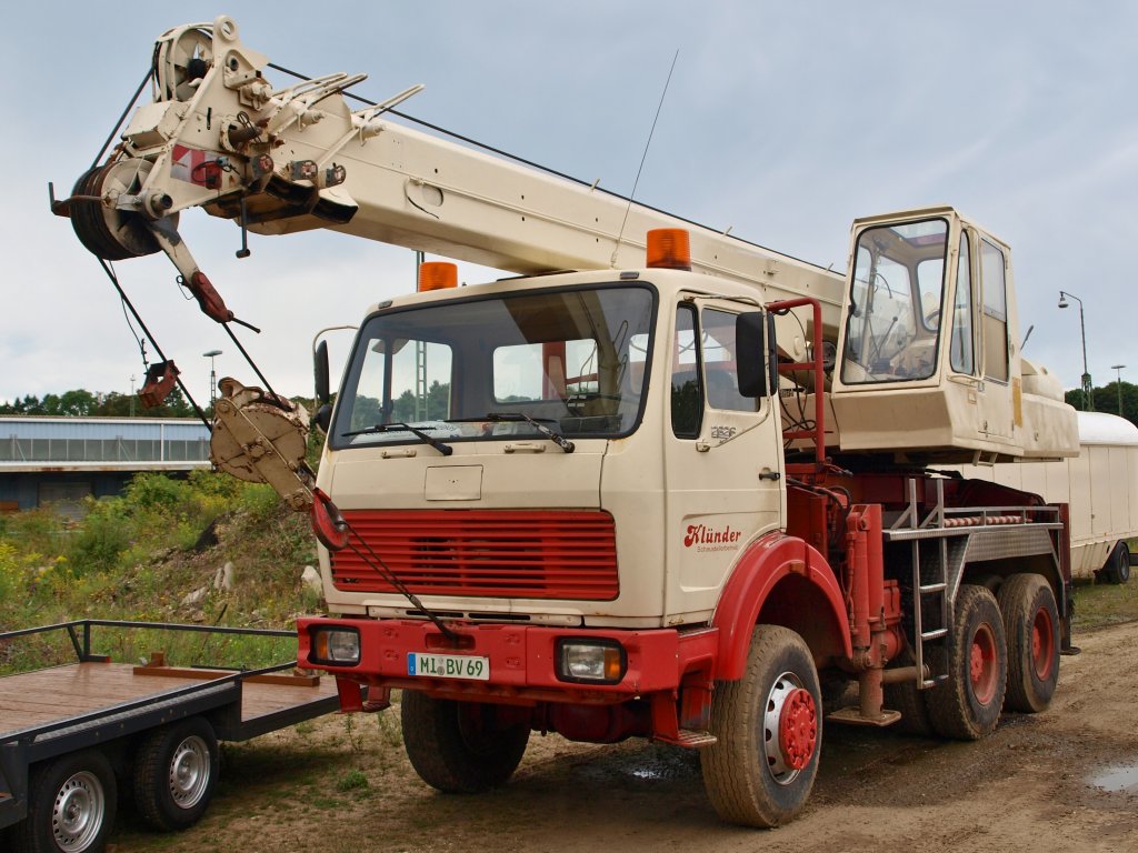 Mercedes 2525 Schaustellerzugmaschine mit Gottwald-Kranaufbau am 22.08.2010 am Aachener Westbahnhof.