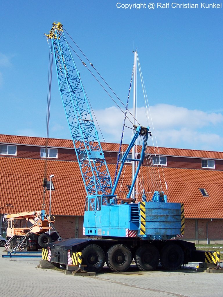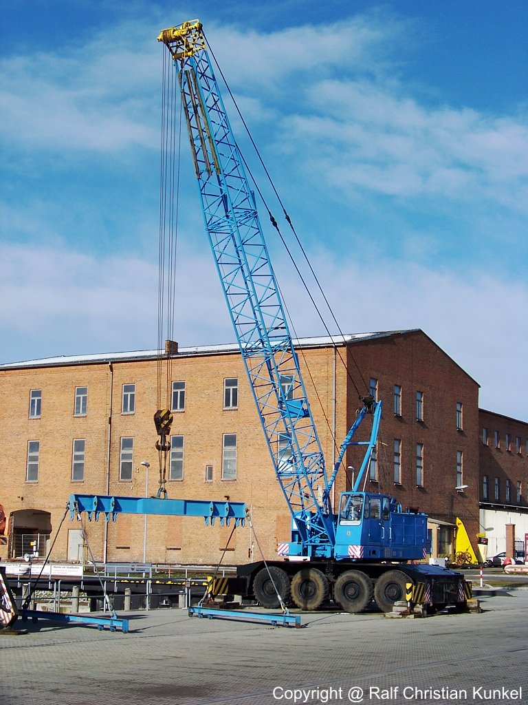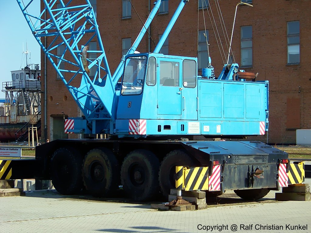 MDK 504/1 - ein TAKRAF Mobildrehkran des VEB Schwermaschinenbau S. M. Kirow Leipzig, Tragfähigkeit 50 t, MDK 504 und 504/1 wurden von 1977 bis 1989 gebaut, 10-Liter-6-Zylinder-Dieselmotor aus Nordhausen mit 150 PS, Fahrgeschwindigkeit 49 km/h (mehr dazu steht in meinem Buch "DDR-Baumaschinen") - das Foto entstand an der Ostsee am 20.03.2007 - Copyright @ Ralf Christian Kunkel