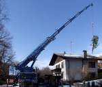 TEREX,120Tonnen Kran von Felbermayr;hievt einen gefällten Baum über ein Haus;110205