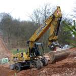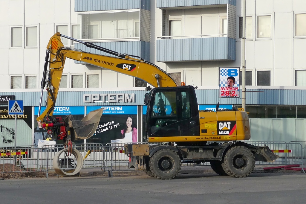 Caterpillar M313D Bagger verlegt ein Rohr in Riihimäki, 2.5.13