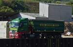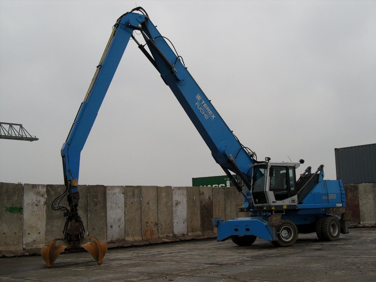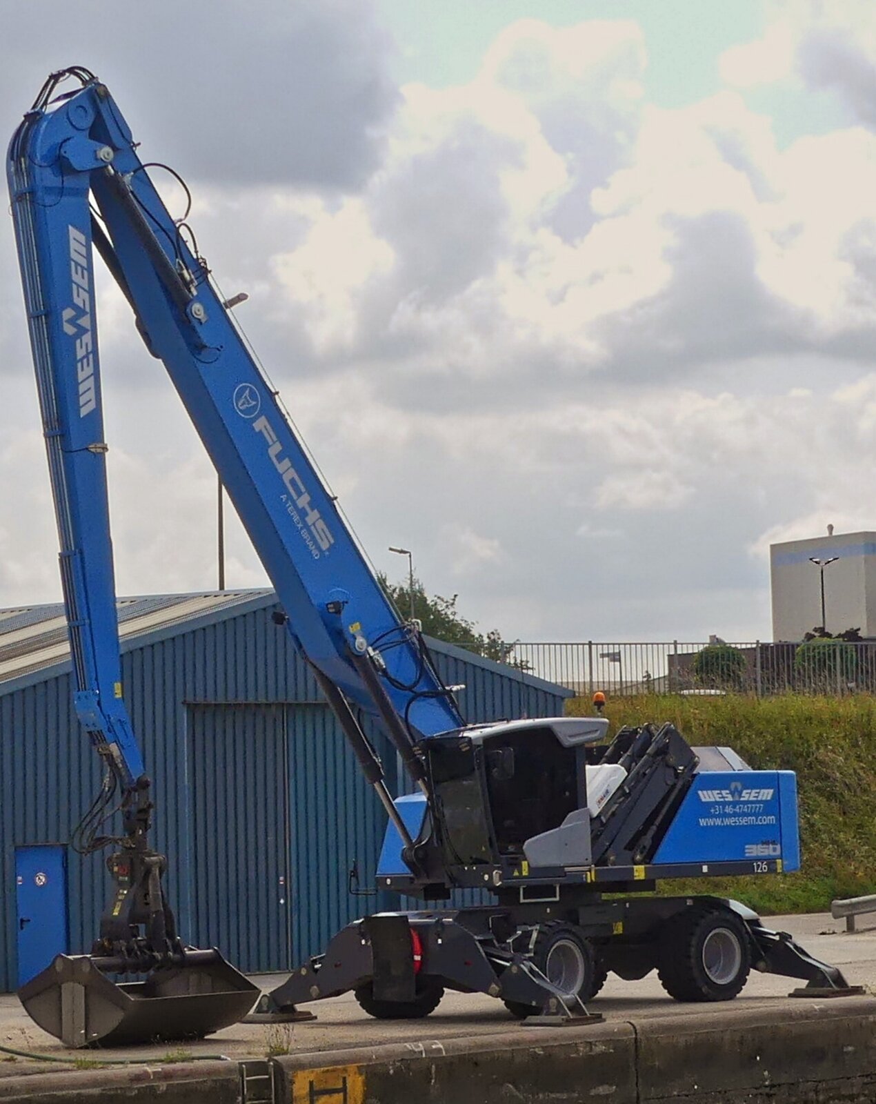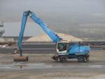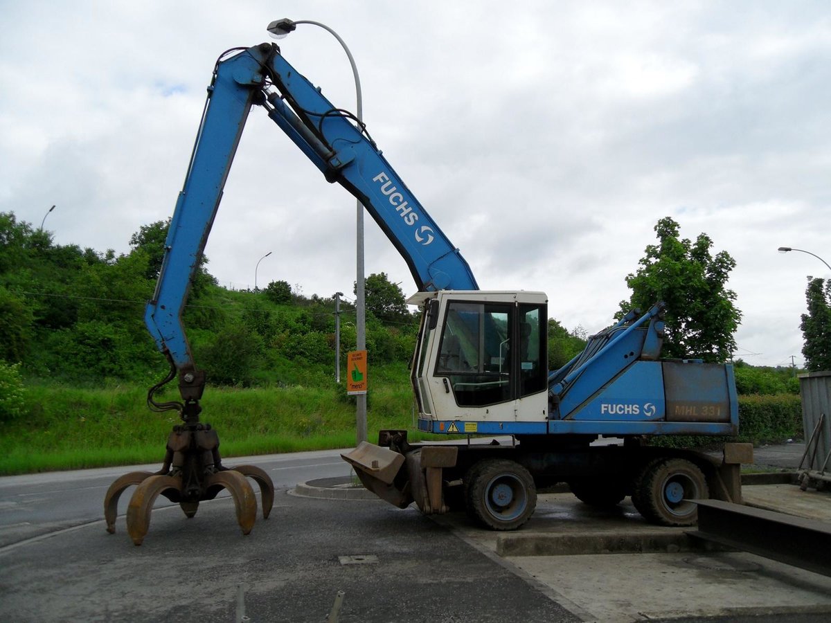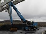Fuchs MHL 360 Umschlagbagger, steht am Kai der Verladestelle. Aufgenommen bei einer Moselrundfahrt vom Schiff. 09.2023