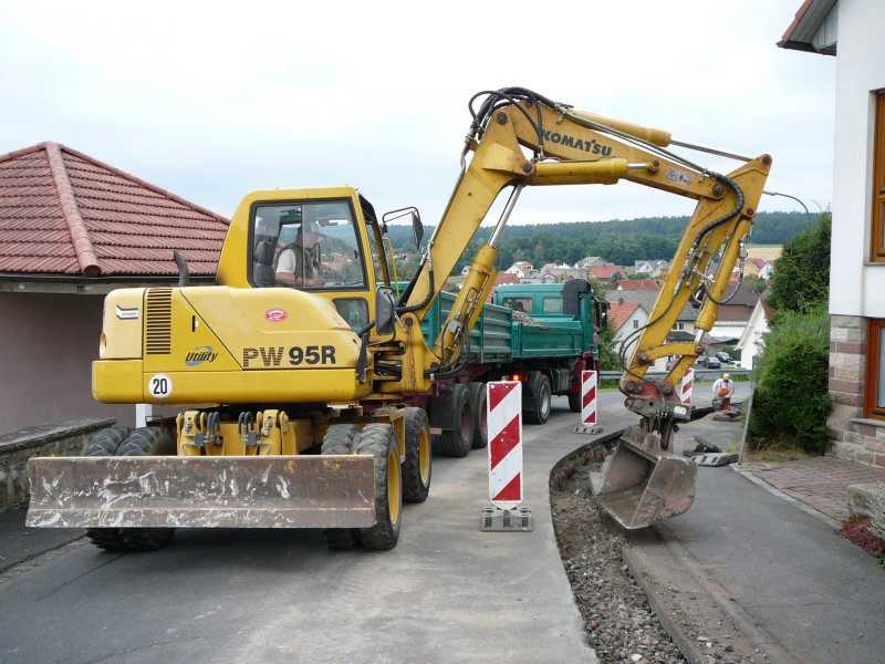 Komatsu Bagger PW95R bei Grabenverfüllarbeiten nach einer Gasleitungsverlegung in 36100 Petersberg-Marbach am 18.07.08