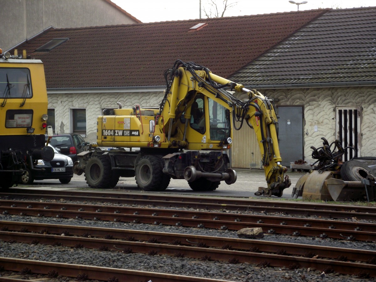Ein Terex Zweiwegebagger steht am 25.11.13 in Hanau Hbf von Gleis 107 aus fotografiert