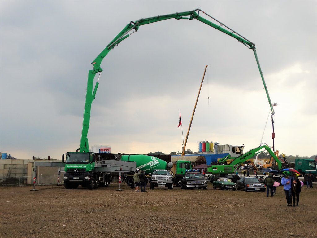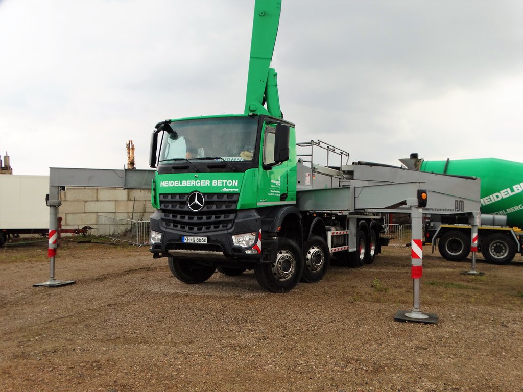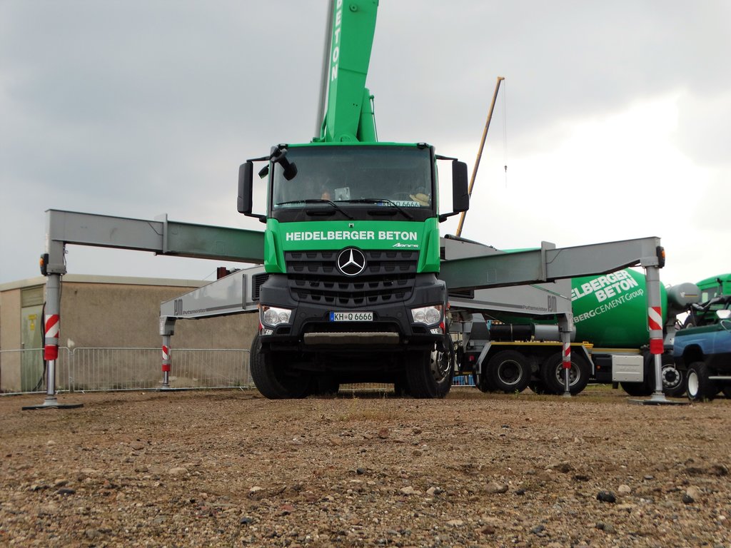 Aufgebaut auf kleinster Fläche, ein 5achser MB V8 Actros mit Putzmeister M52-5 Betonpumpe (52m Förderhöhe-weite). Im hintergrund sieht man die Betonmischer die die Pumpe füttern.