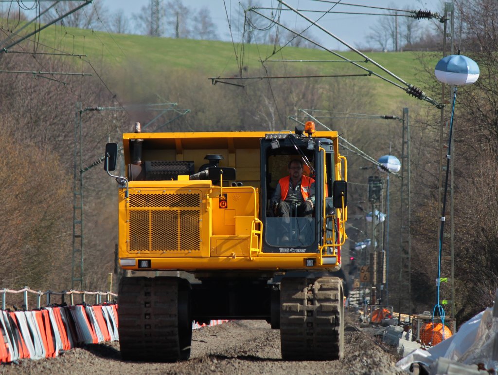 Komatsu Raupendumper, der sich auf seinem Raupenfahrwerk komplett drehen kann. Ein echter Vorteil, er braucht sich nicht mit den Ketten auf der Stelle drehen und den Untergrund zerstören. Hier fährt er mit Schotter am 09.03.2012 auf einer DB Baustelle in Aachen Eilendorf.
