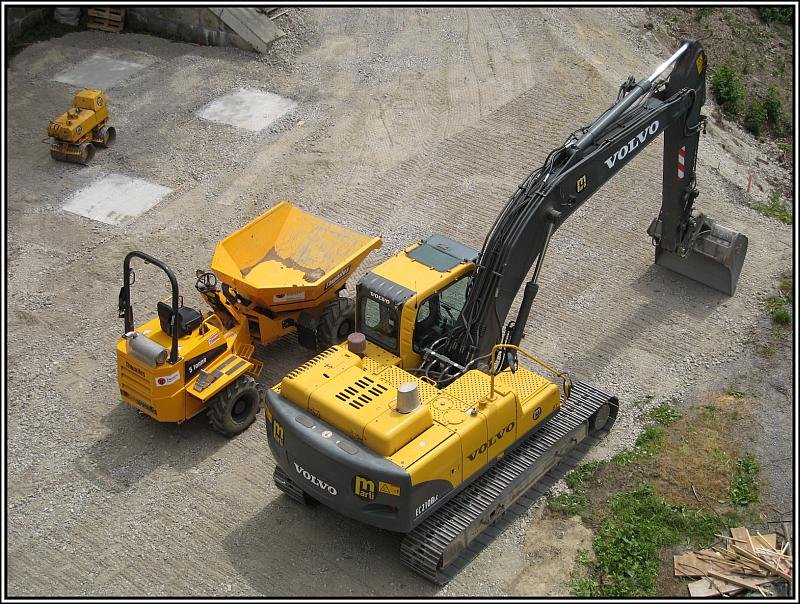 Ein Volvo-Bagger Typ EC210B sowie ein Dumper, aufgenommen am 26.07.2008 in Bern von der Nydeggbrücke aus, nahe dem Bärengraben.