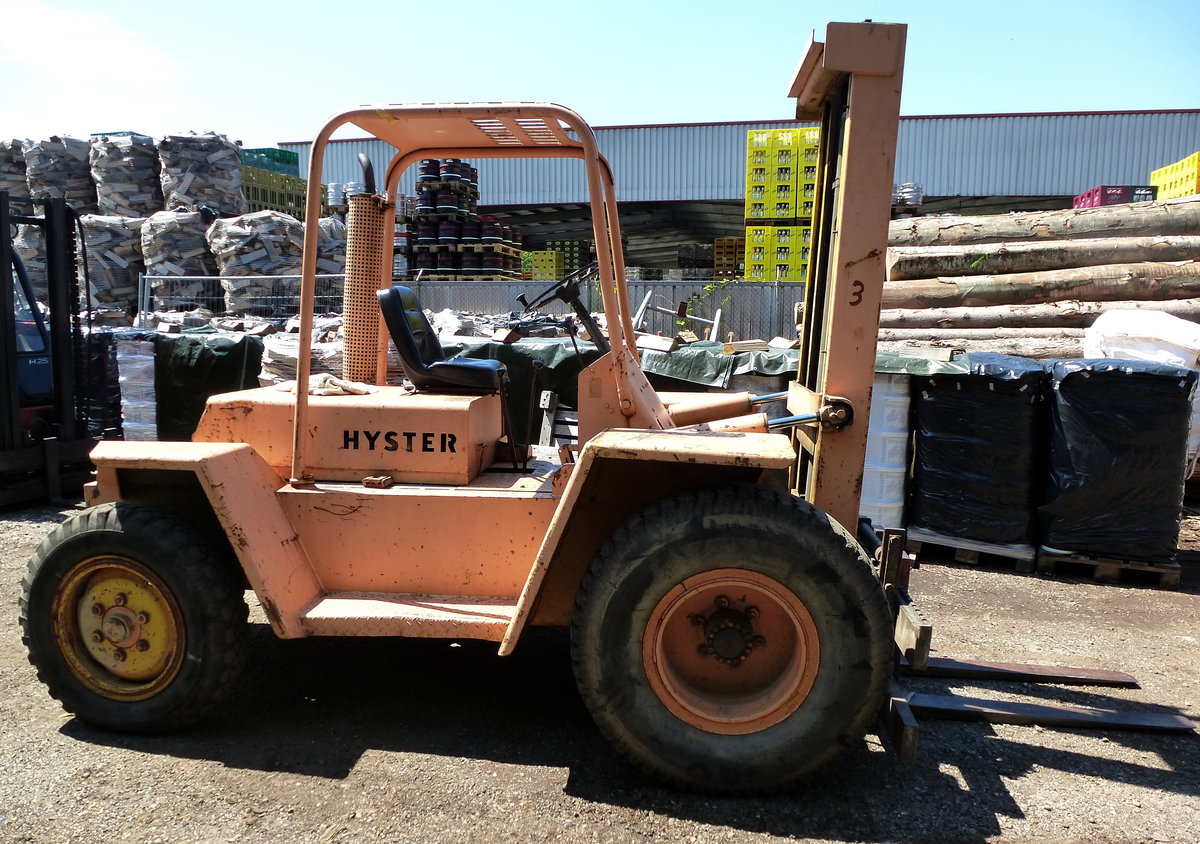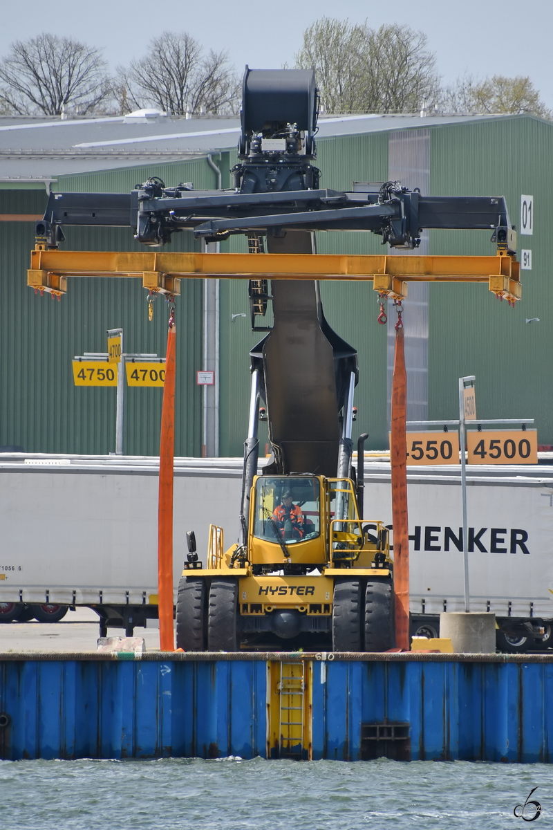 Ein Container-Stapler von Hyster macht sich bereit für den nächsten Einsatz. (Travemünde, Mai 2023)