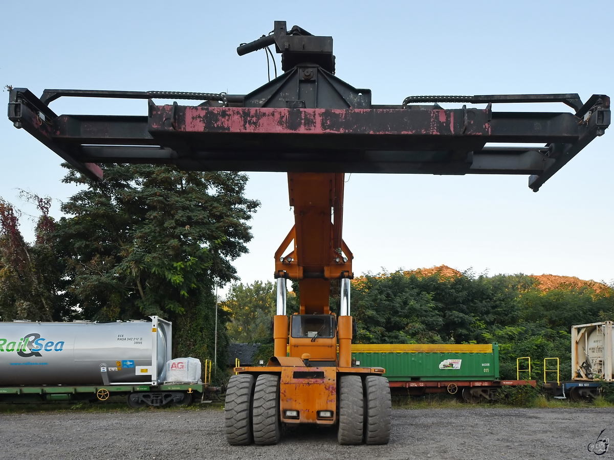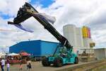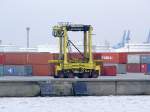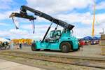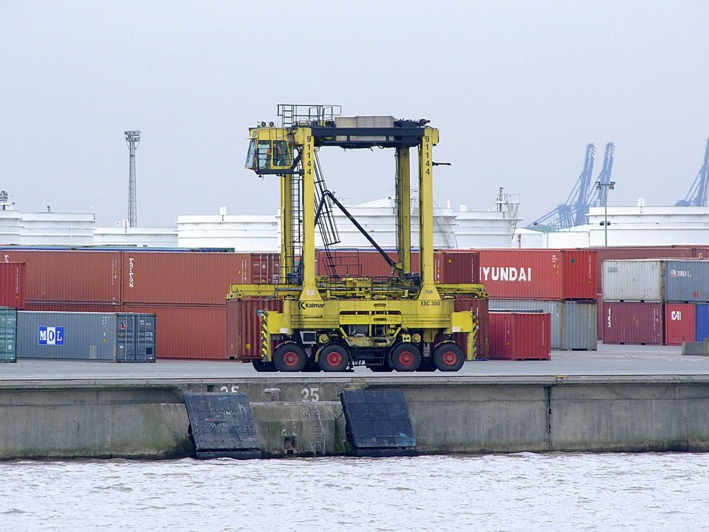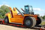 KALMAR; Portalhubwagen ESC350 (Hubkapazität 50t); eilt mit einem 40' Container im Hafen von Antwerpen zu dessen Bestimmungsplatz; 110830