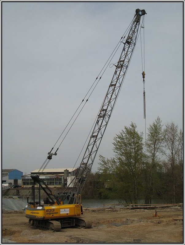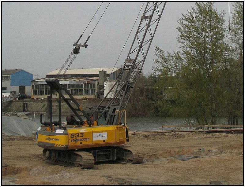 Düsseldorf, Hafenspitze, 27.04.2008: Und noch einmal der Sennebogen-Seilbagger, etwas näher herangeholt.