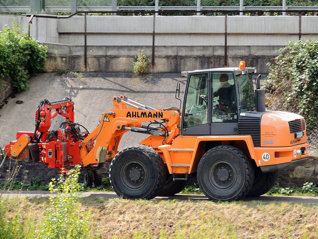 AHLMANN AS150 ist mit einem Mähwerk entlang des Rheinufers unterwegs; 120829