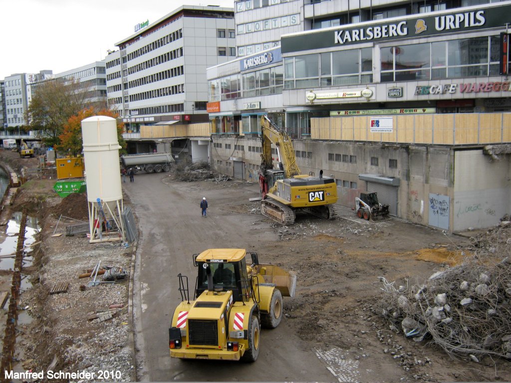 Radlader und Bagger beim Teil Abriss der Berliner Promenade in Saarbrücken. Das Foto habe ich am 16.10.2010 gemacht.