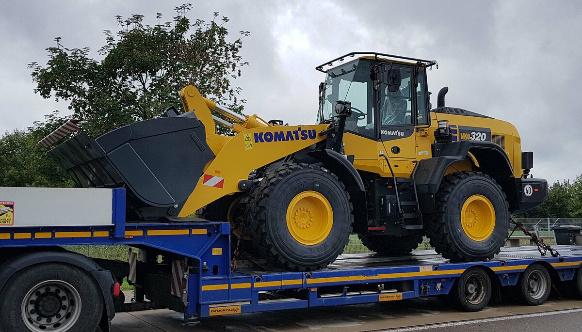 =Komatsu WA 320 steht verlastet auf einem Schwerlasthänger, 09-2022