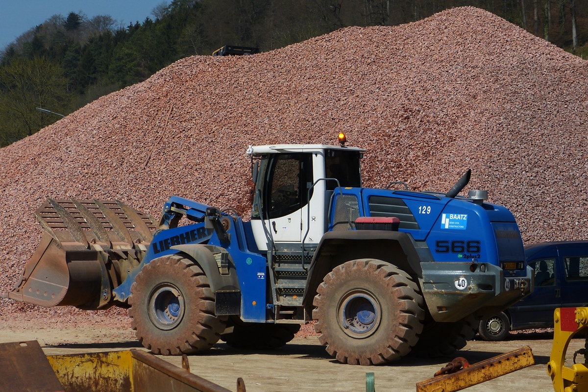 . Liebherr 566 Radlader bei dem Schotterhaufen der Bahnbaustelle nahe Mersch. 09.04.2015.