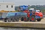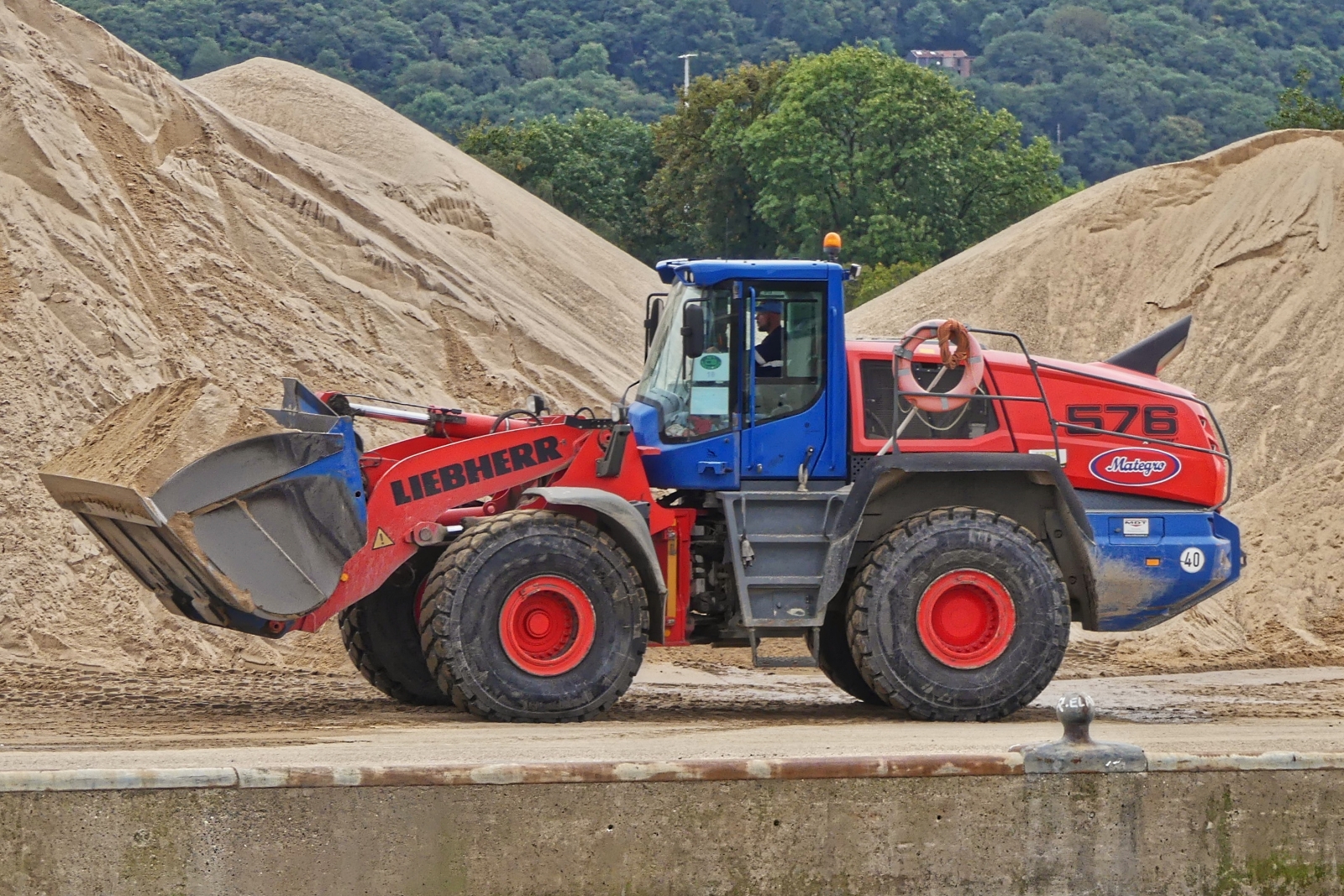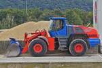 Liebherr 576 Radlader, entleert seine Schaufel Sand in den Kipperauflieger. 09.2025