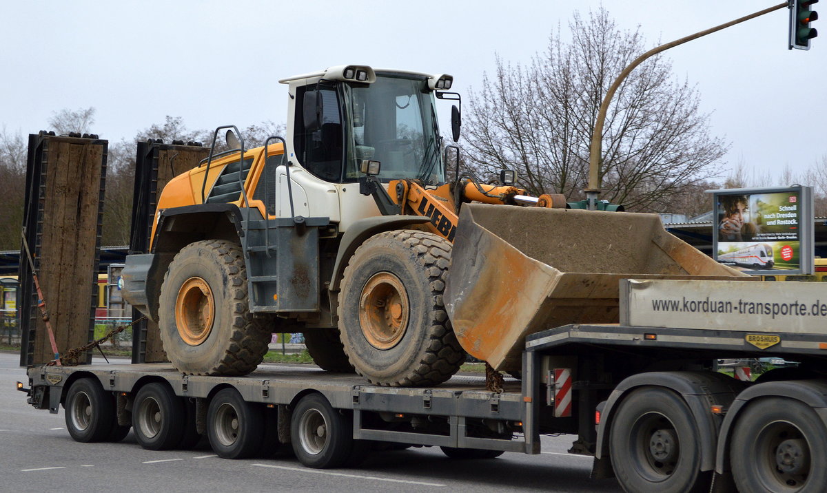 Ein schwerer LIEBHERR L 566 oder L 576? Radlader auf Tiefladebrücke am 13.03.20 Berlin Marzahn.