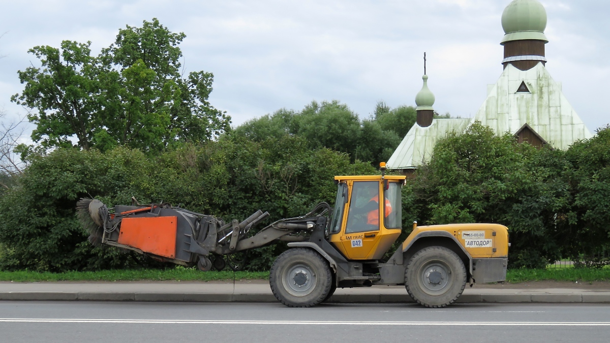Ein ganz besonderes Straßenreinigungsgerät hängt an einem LAI-MU LM Trac 586 in Kolpino, 26.8.17, dessen Funktion die nächsten vier Bilder veranschaulichen.