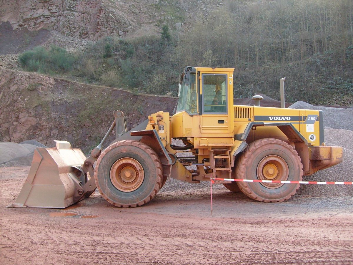 Volvo Knicklenker L 308 PRO, steht auf einem Lkw Hänger, nahe einer Baustelle. 11-2025