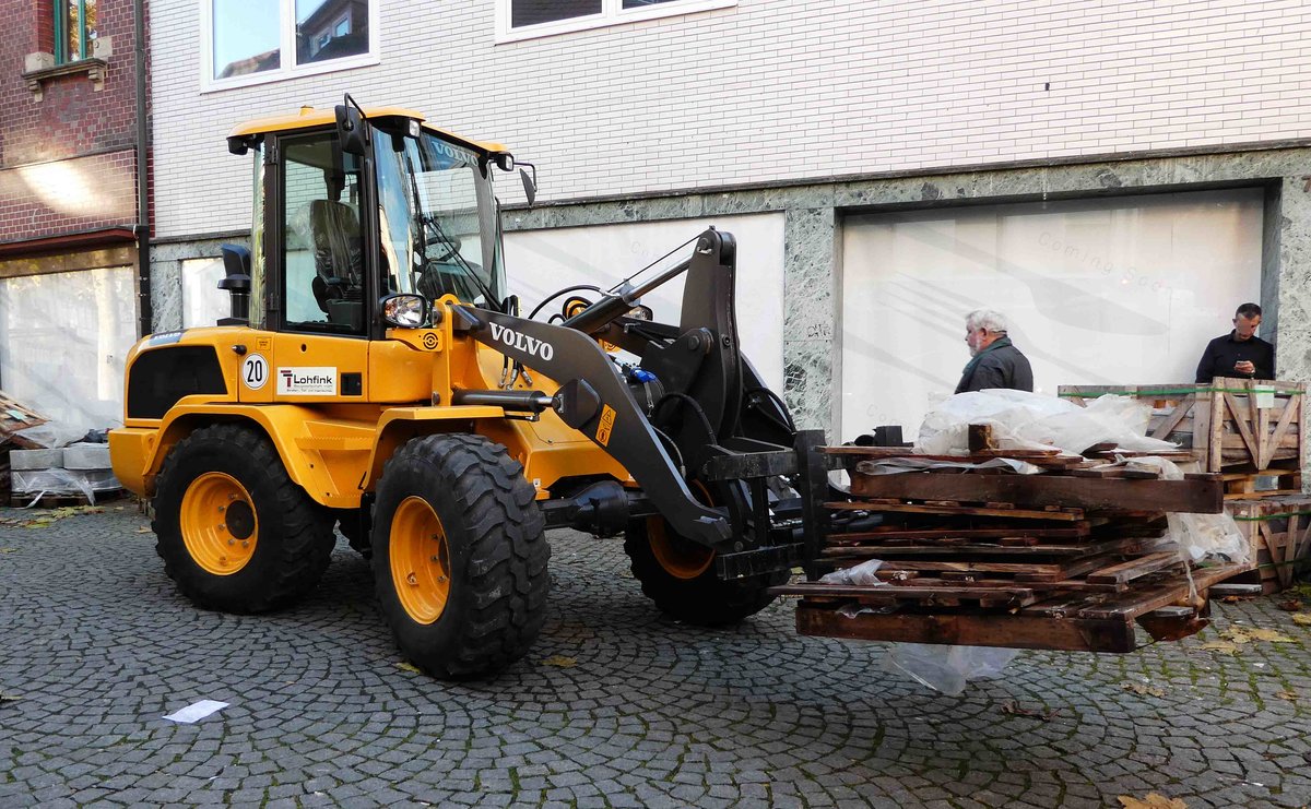 =Volvo-Radlader der Firma LOHFINK steht auf einer Baustelle in Fulda, 11-2017