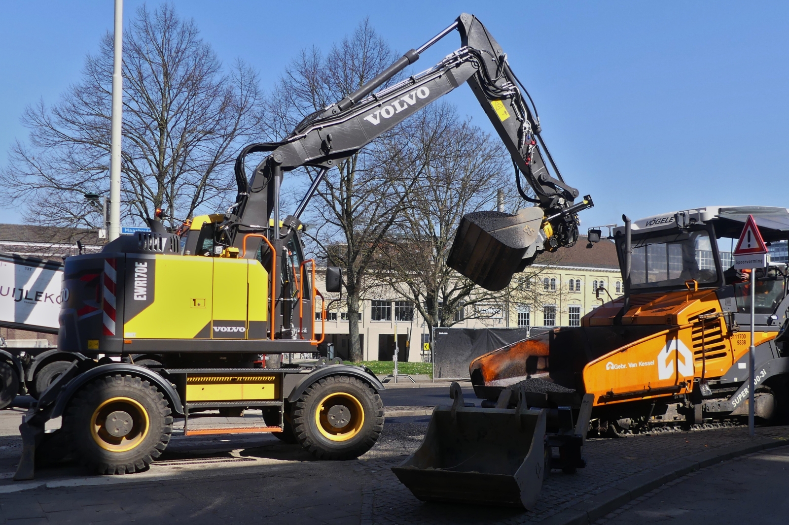 Volvo EWR170E Radlader, ist dabei den Vögele Asphaltfertiger mit Asphalt zu befüllen. 03.2025