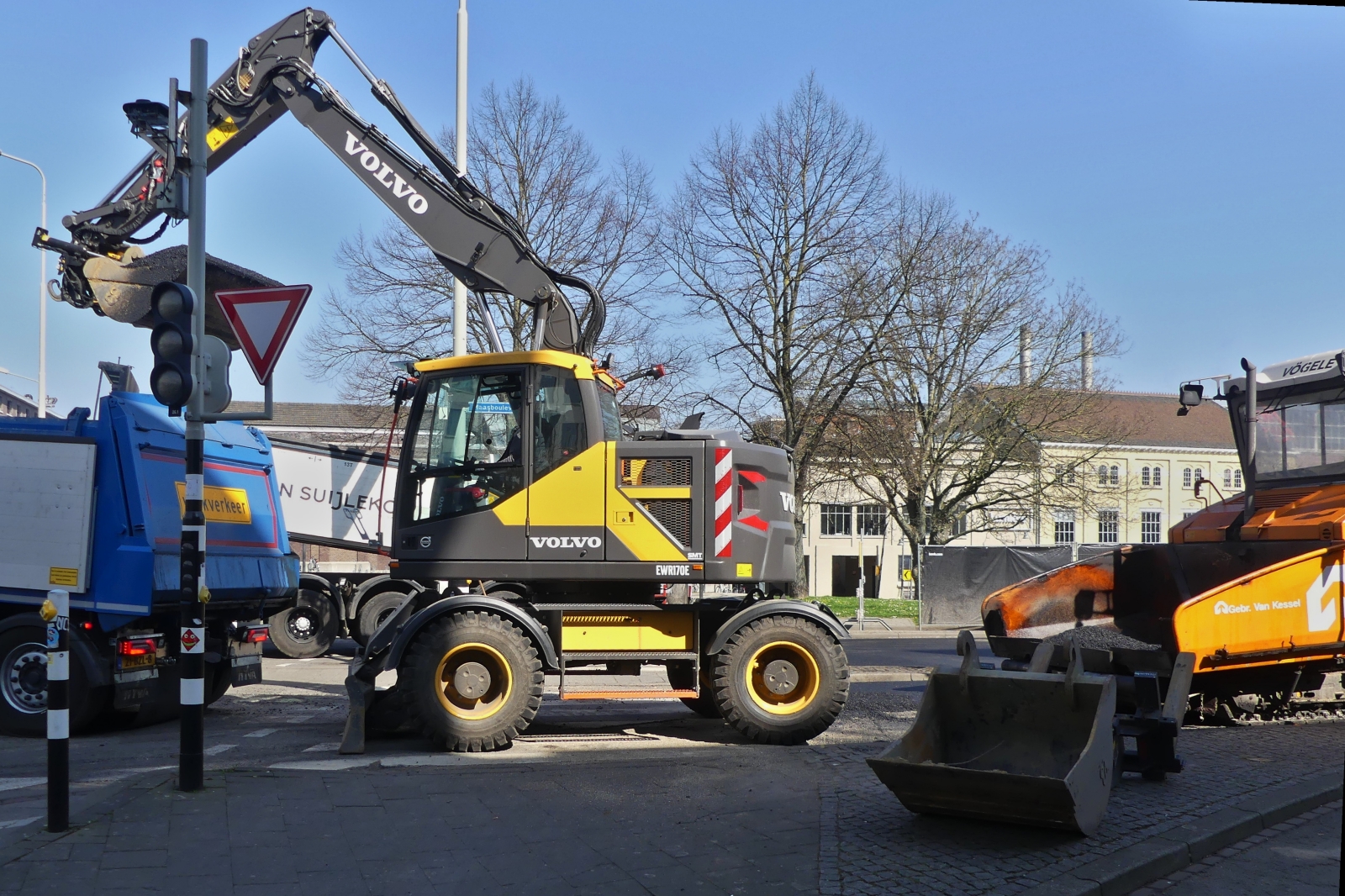 Volvo EWR170E Radlader, holt sich von dem schräg gestellten Kipper eine Ladung Asphalt ab. 03.2025
