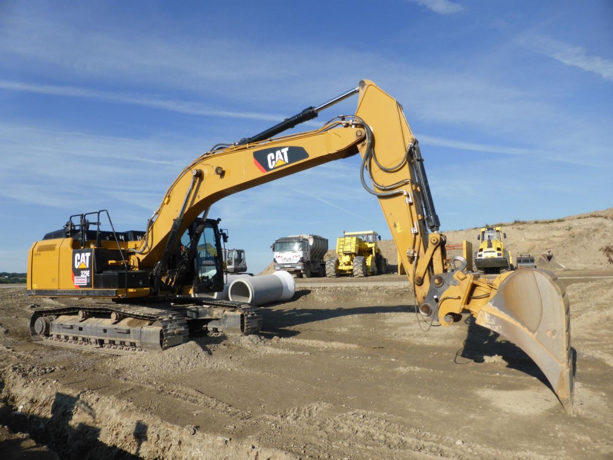 Caterpillar 329E LN (Baujahr 2014, zul. Gesamtgewicht 29.520 kg, Leistung 179 kW) am 26.07.2015 in der Nähe von Longkamp