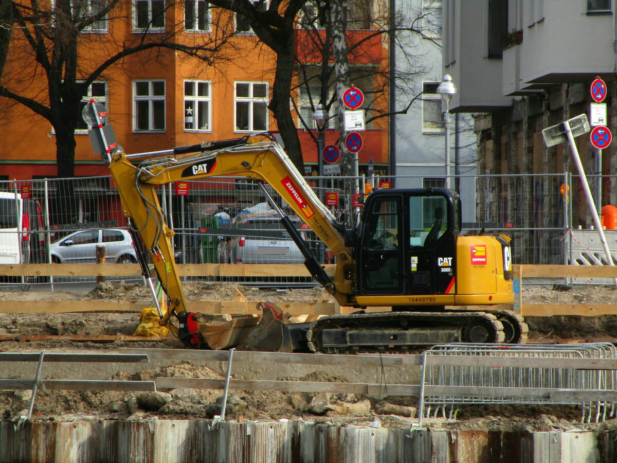 Caterpillar Raupenbagger, stand nahe einer Baustelle. 04.2025