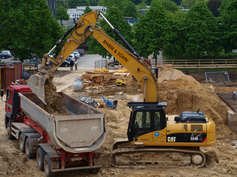 Caterpillar 324D LN beim beladen eines LKW auf einer Großbaustelle der RWTH in Aachen