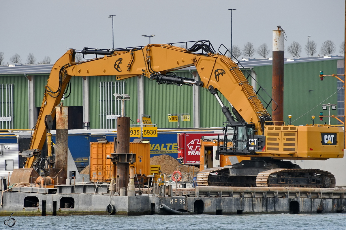 Ein Caterpillar 390F Raupenbagger ist hier im Mai 2023 in Travemünde zu sehen.