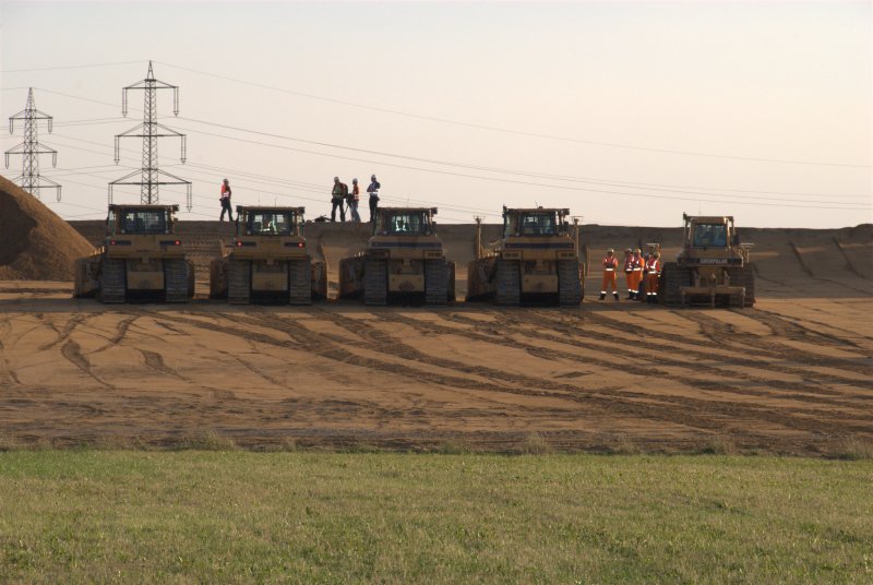 Mehrere Caterpilar-Raupen warten am frühen Abend des 29.08.2009 an der A61 bei Bergheim auf ihren Einsatz. (um den Absetzer 746 und Bandschleifwagen 946 das Überqueren der A61 zu Ermöglichen)