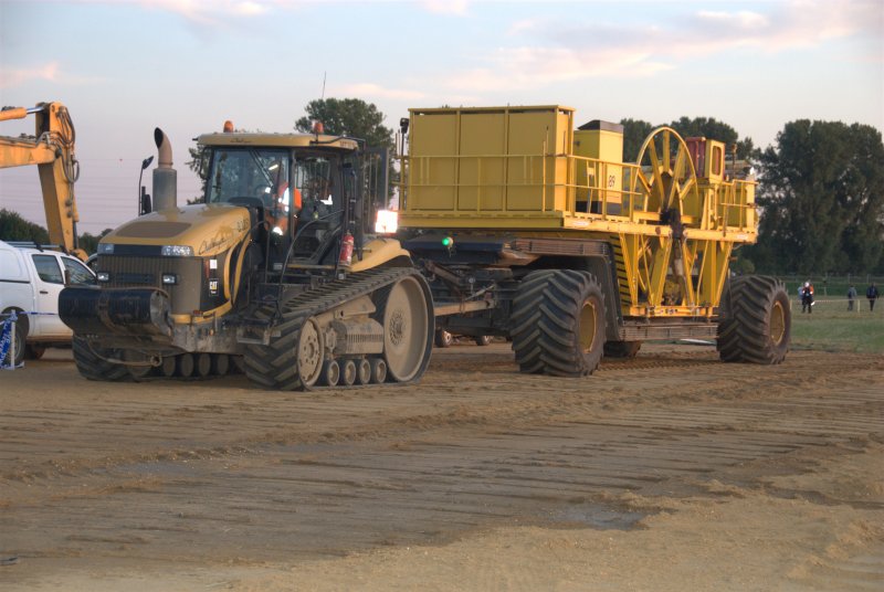 Das Foto zeigt eine Caterpilar Challenger-Raupe als Zugmaschiene eines Kabelwagens von RWE-Power