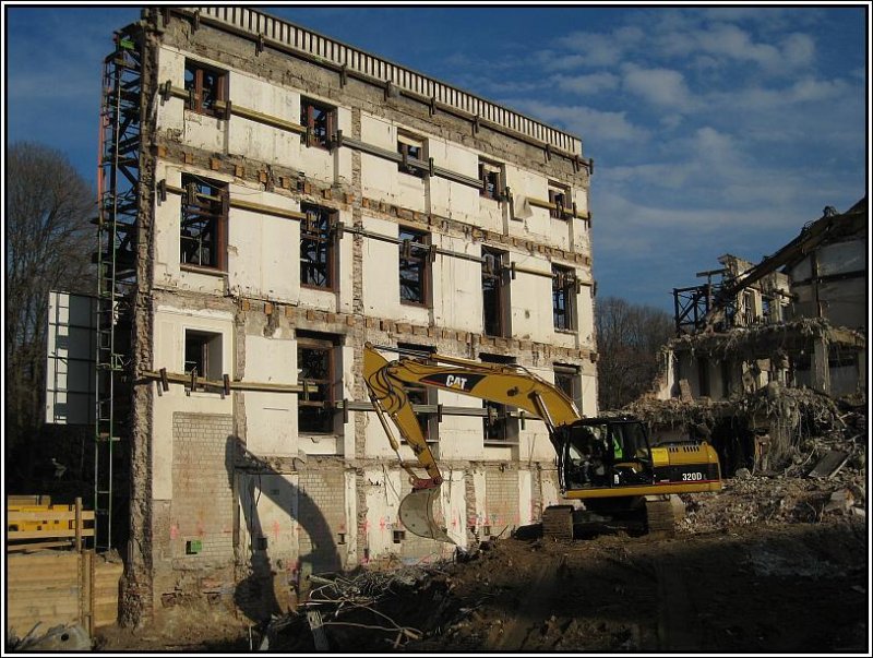 Ein CAT-Bagger Typ 320D bei Aufräumarbeiten am 22.11.2007 nahe dem Hofgarten in Düsseldorf. Hier wurde ein größerer Bürogebäude-Komplex abgerissen, um Platz zu schaffen für ein neues Bürogebäude sowie Luxuswohnungen, Projektbezeichnung "Hofgarten Palais". Die Wohnungen u.a. sollen hinter diese alte denkmalgeschützte Fassade kommen, die hier großem Aufwand gesichert wird.