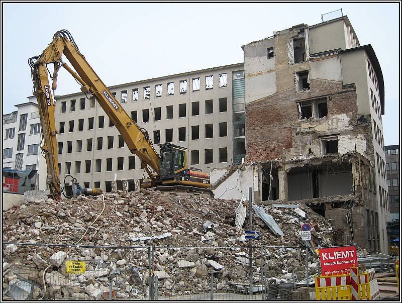 Abriss eines größeren Gebäudekomplexes in Düsseldorf, Ecke Bleichstraße/Schadowstraße. Im Bild einer der eingesetzten Caterpillar-Bagger, hier nochmals der Typ 330 B. Diese Aufnahme stammt vom 05.06.2008.